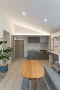 LDKは木目の床とグレートーンのキッチンで統一。折り上げ天井と間接照明が奥行きを演出し、落ち着きのある上質な空間に仕上げました。
